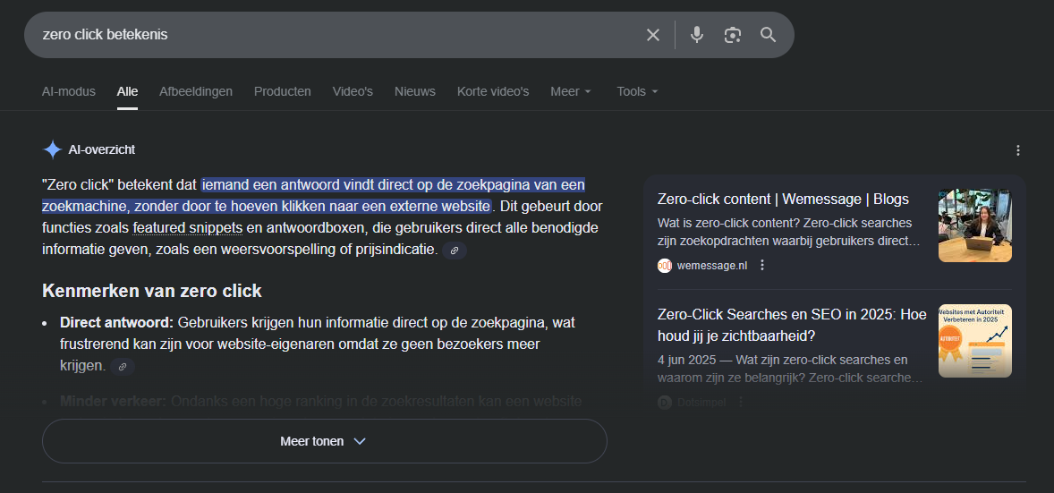 Steeds vaker geeft Google het antwoord al in de zoekresultaten zelf. Denk aan een kort tekstblokje, een lijstje of een veelgestelde vraag die direct zichtbaar is zonder dat iemand op een link hoeft te klikken. Dit heet een zero-click search.